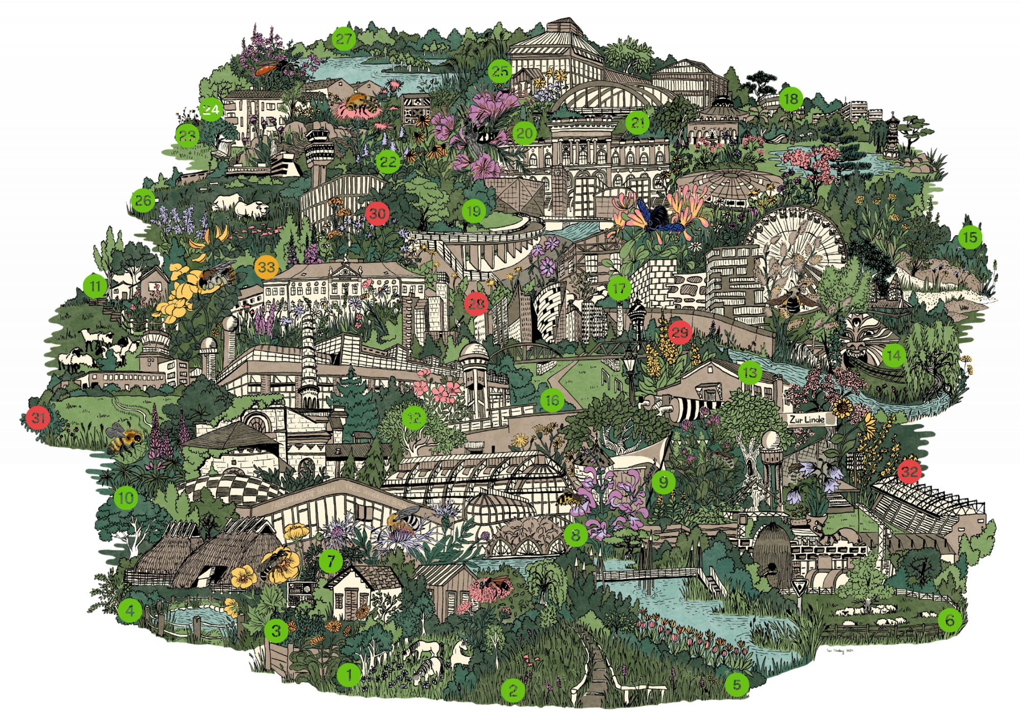 1 Lichterfelder Weidelandschaft · 2 Freizeitpark Marienfelde · 3 Kolonie Wildkraut e. V. · 4 Museumsdorf Düppel · 5 Britzer Garten · 6 Flugplatz Johannisthal · 7 Freie Universität Berlin · 8 Botanischer Garten Berlin · 9 Tempelhofer Feld · 10 Naturschutzzentrum Ökowerk Berlin e. V. · 11 Naturschutzstation Hahneberg · 12 Natur Park Südgelände · 13 Kleingartenanlage Zur Linde e. V. · 14 Spreepark · 15 Biesenhorster Sand · 16 Park am Gleisdreieck · 17 Lokschuppen Berlin · 18 Gärten der Welt · 19 Wildbienen-Lehrpfad Spreebogenpark · 20 Museum für Naturkunde · 21 Pankower Tor · 22 / 23 PikoParks Reinickendorf · 24 Charlottenburger Baugenossenschaft eG · 25 Botanischer Volkspark Blankenfelde · 26 Ehemaliger Flughafen Berlin-Tegel TXL · 27 Naturschutzgebiet Köppchensee