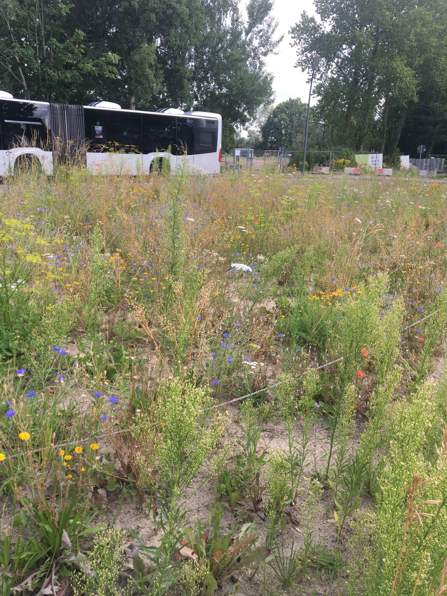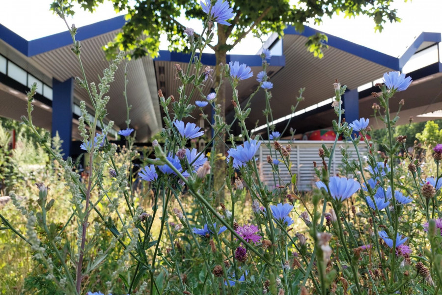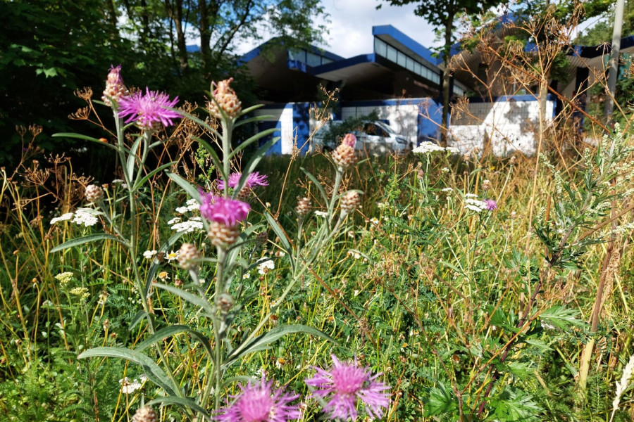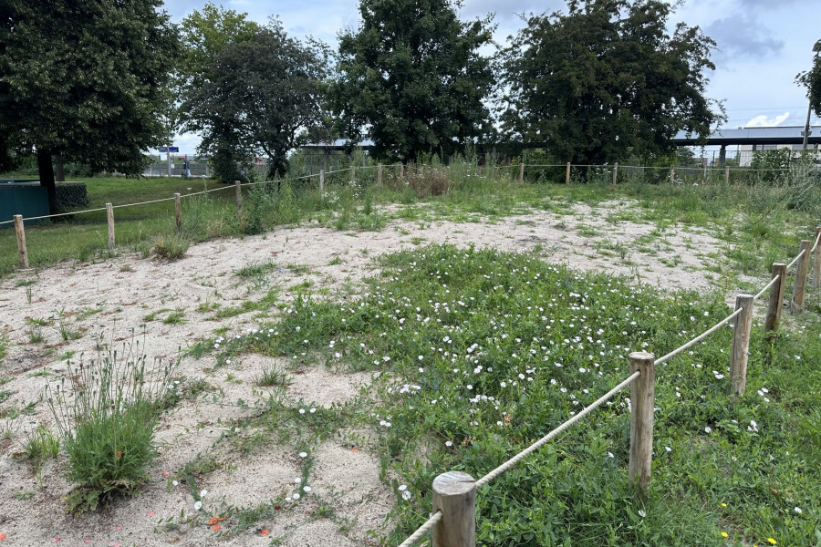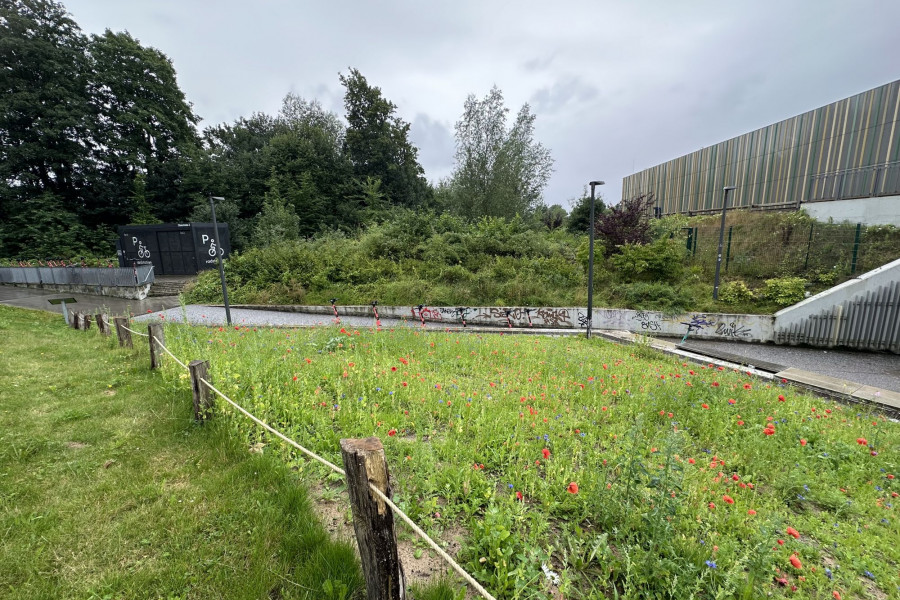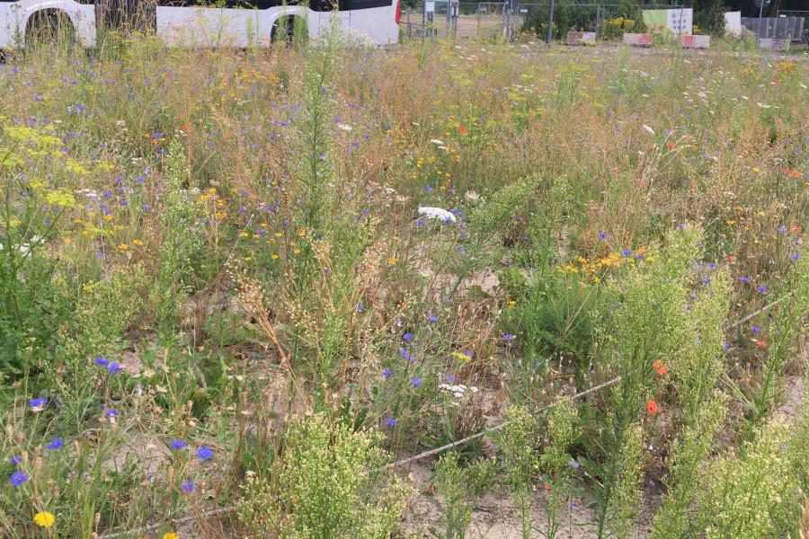 Für die Umgestaltung wurde zunächst die vorhandene Grasnarbe entfernt und der Boden teilweise ausgekoffert und mit neuem, nährstoffärmerem Substrat aufgefüllt. Dadurch entstehen bessere Bedingungen für eine artenreiche Wildblumenvegetation. Anschließend wurde die Fläche mit zertifiziertem, gebietsheimischem Wildblumensaatgut eingesät und durch Initialpflanzungen heimischer Wildstauden ergänzt. Die Pflanzen bieten über einen langen Zeitraum Nektar und Pollen und schaffen so ein vielfältiges Nahrungsangebot für Wildbienen und andere bestäubende Insekten.