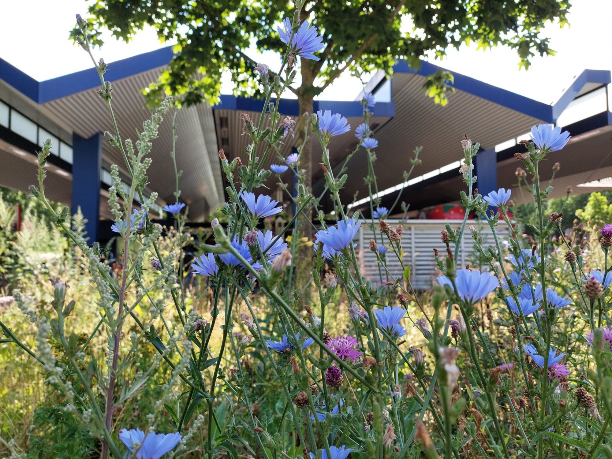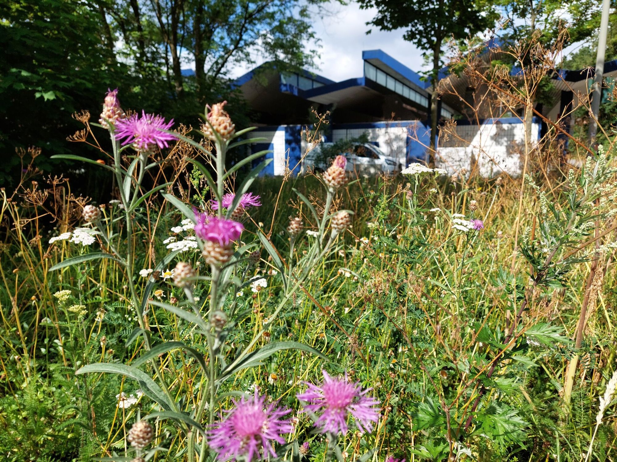 Mit Unterstützung von Spenden wurde die zuvor kurz gemähte Grünfläche in einen vielfältigen Lebensraum für Wildbienen umgestaltet. Dafür wurde eine regional zertifizierte, mehrjährige Wildblumenmischung eingesät, die über die gesamte Flugsaison hinweg Nahrungsangebote für verschiedene Wildbienenarten bietet.