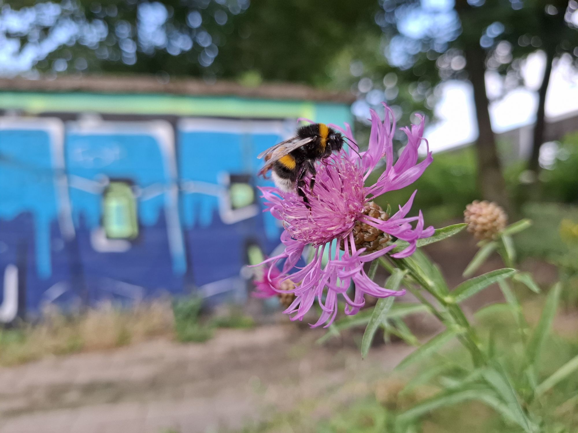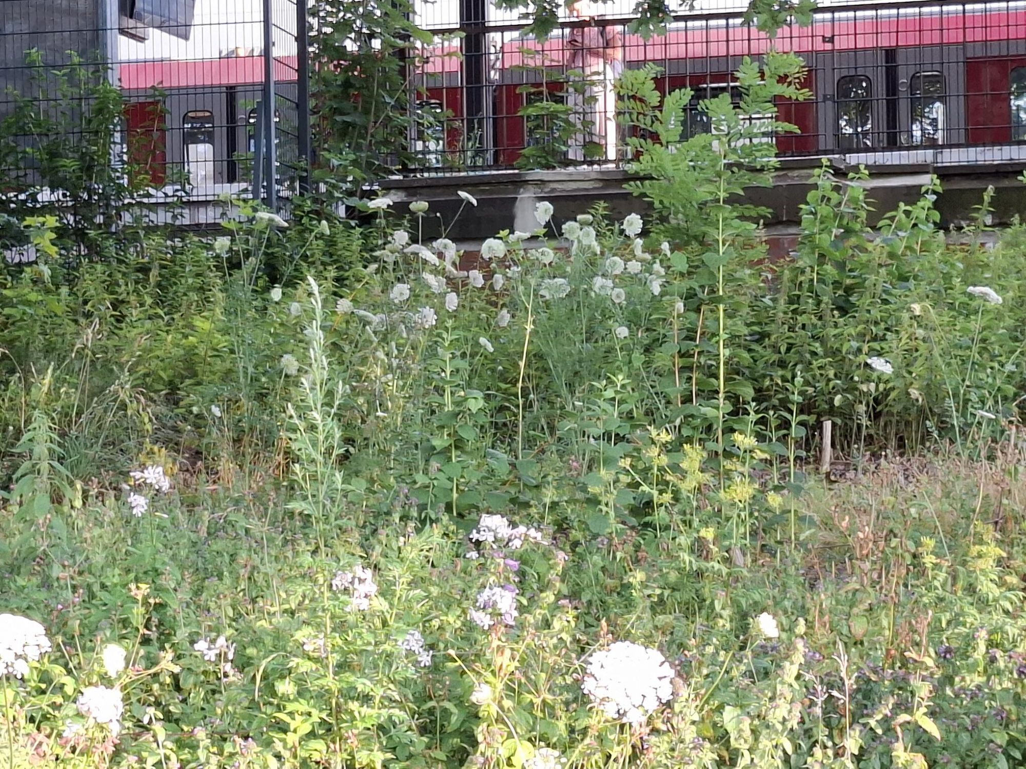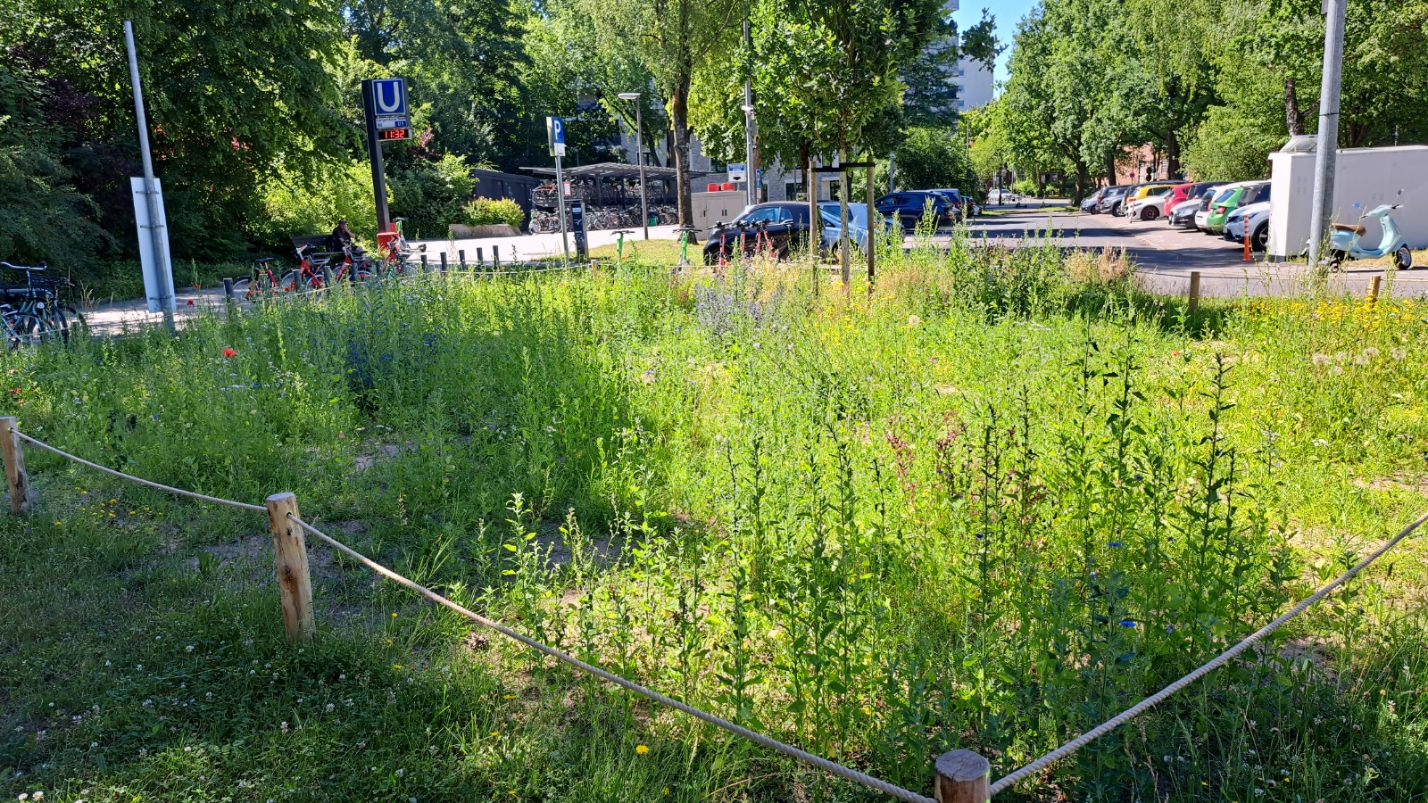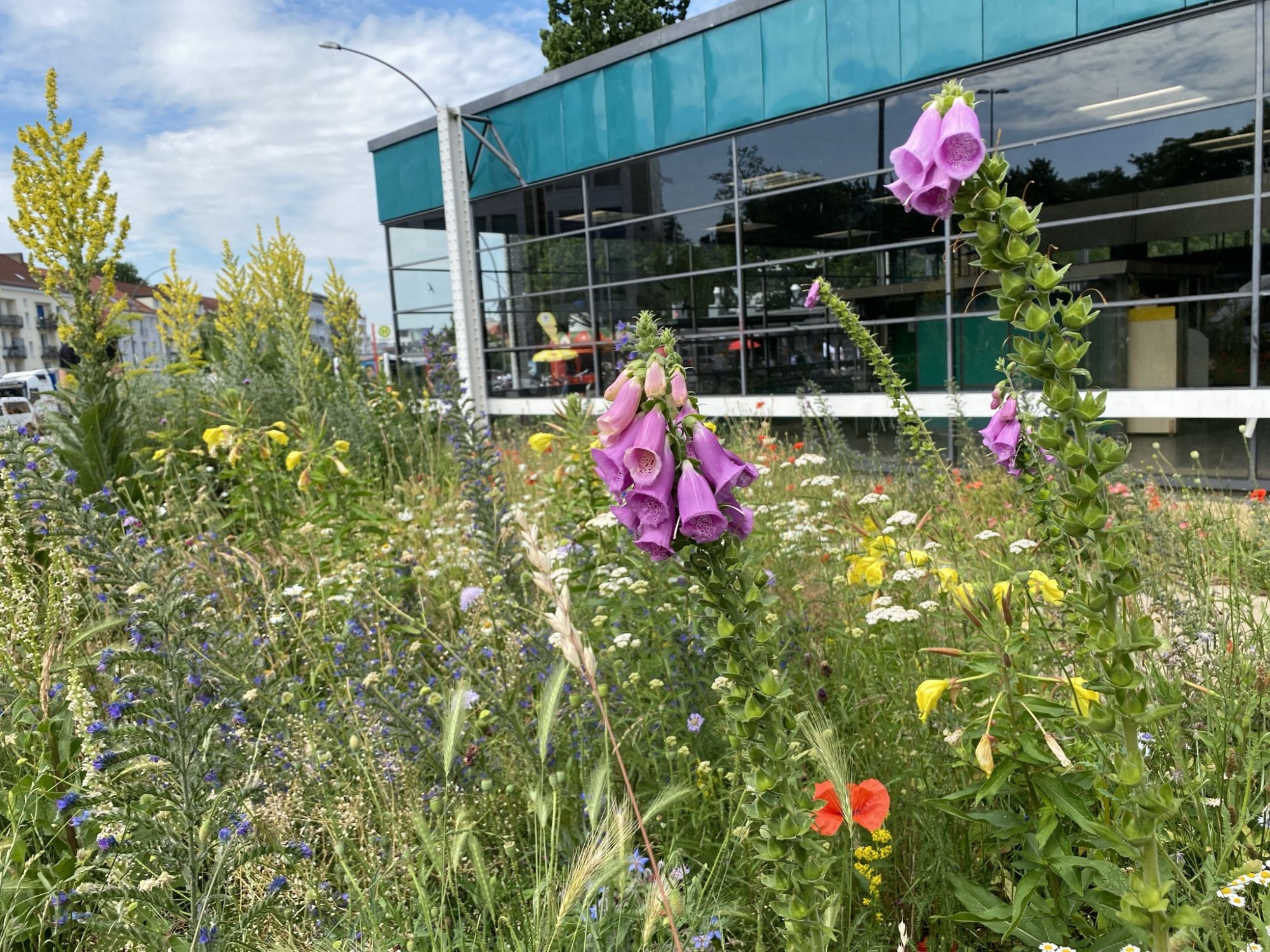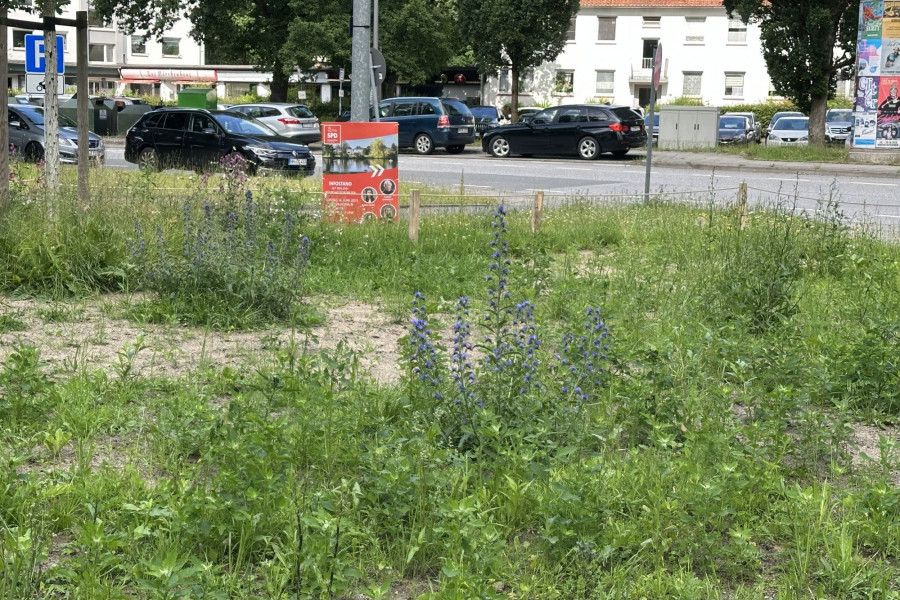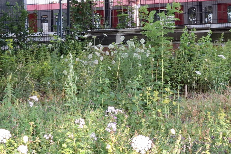 Die Fläche entwickelte sich schnell zu einer artenreichen Blühfläche und blühte bereits im Folgejahr sehr prächtig. Besonders auffällig sind unter anderem hohe Königskerzen. Trotz der stark frequentierten Lage konnten zahlreiche Wildbienen beobachtet werden, was die Bedeutung kleiner urbaner Flächen als Lebensraum für Insekten unterstreicht.