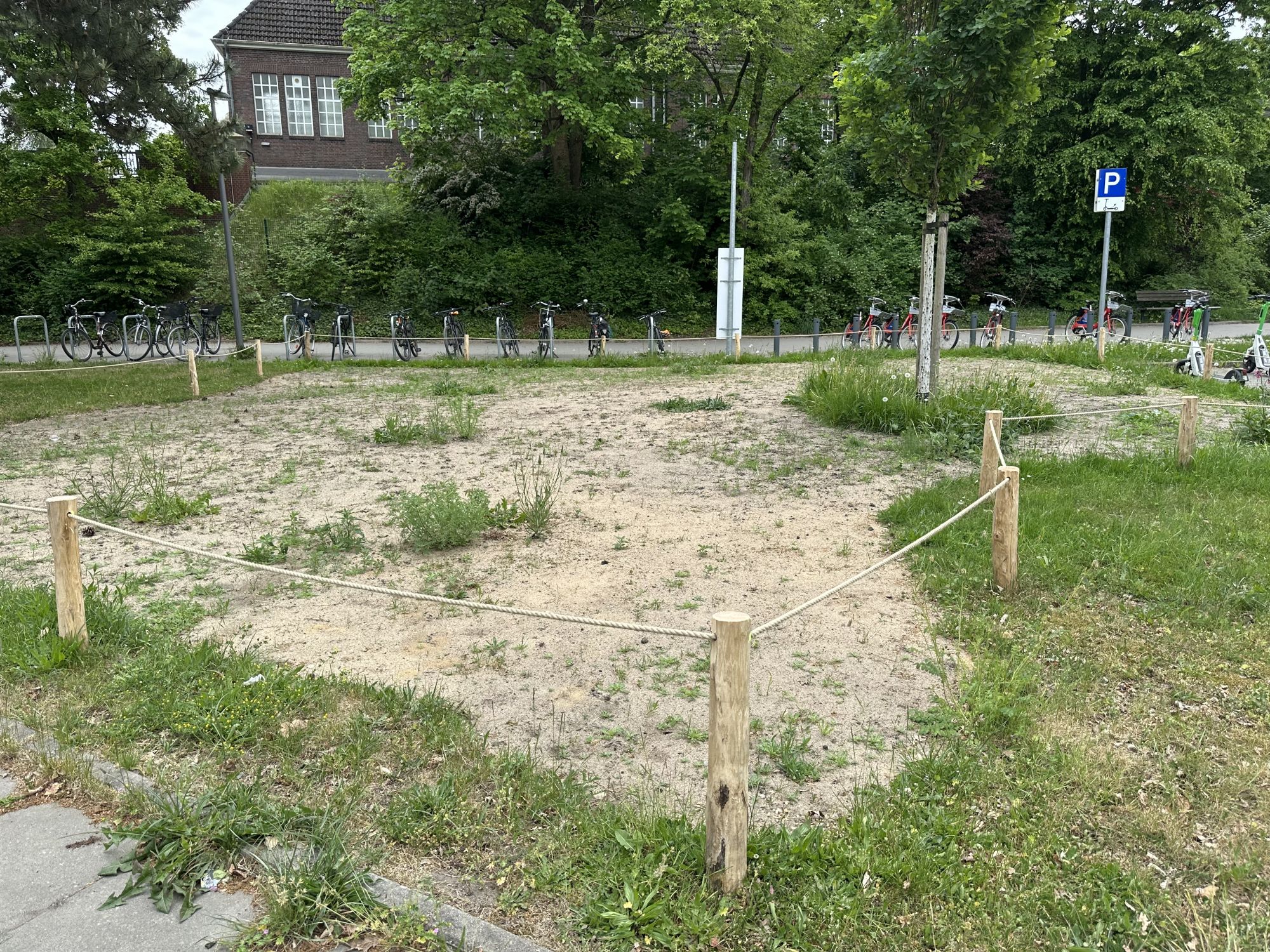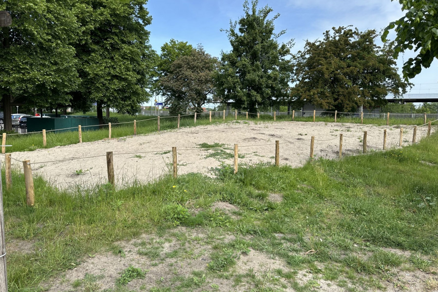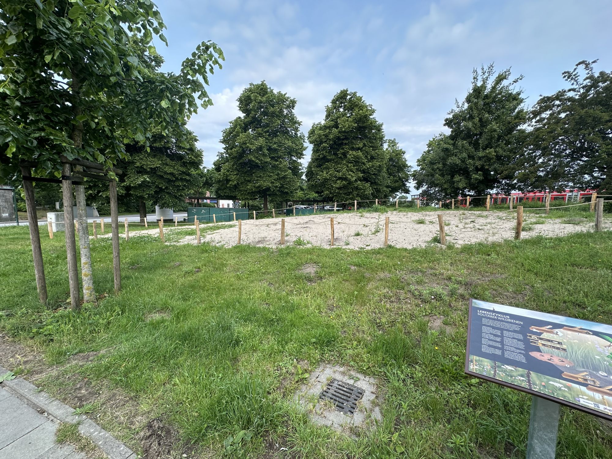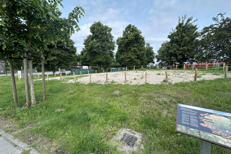 Die Blühfläche ist mit Holzpfählen und Hempexseil abgegrenzt. Eine Informationstafel wird künftig über die Bedeutung von Wildbienen und blütenreichen Lebensräumen informieren. Ab dem Frühjahr 2026 werden die ersten Pflanzen blühen.