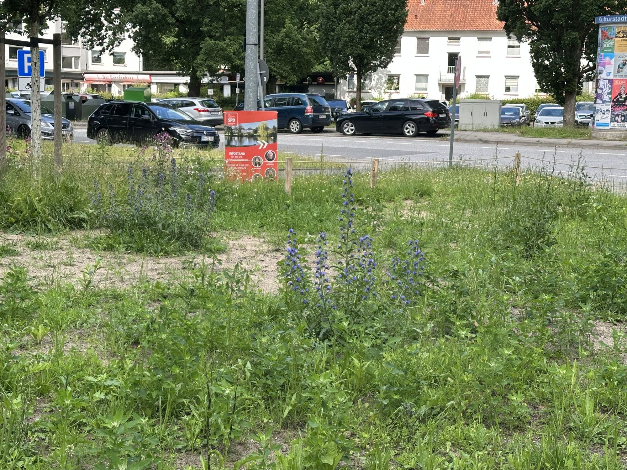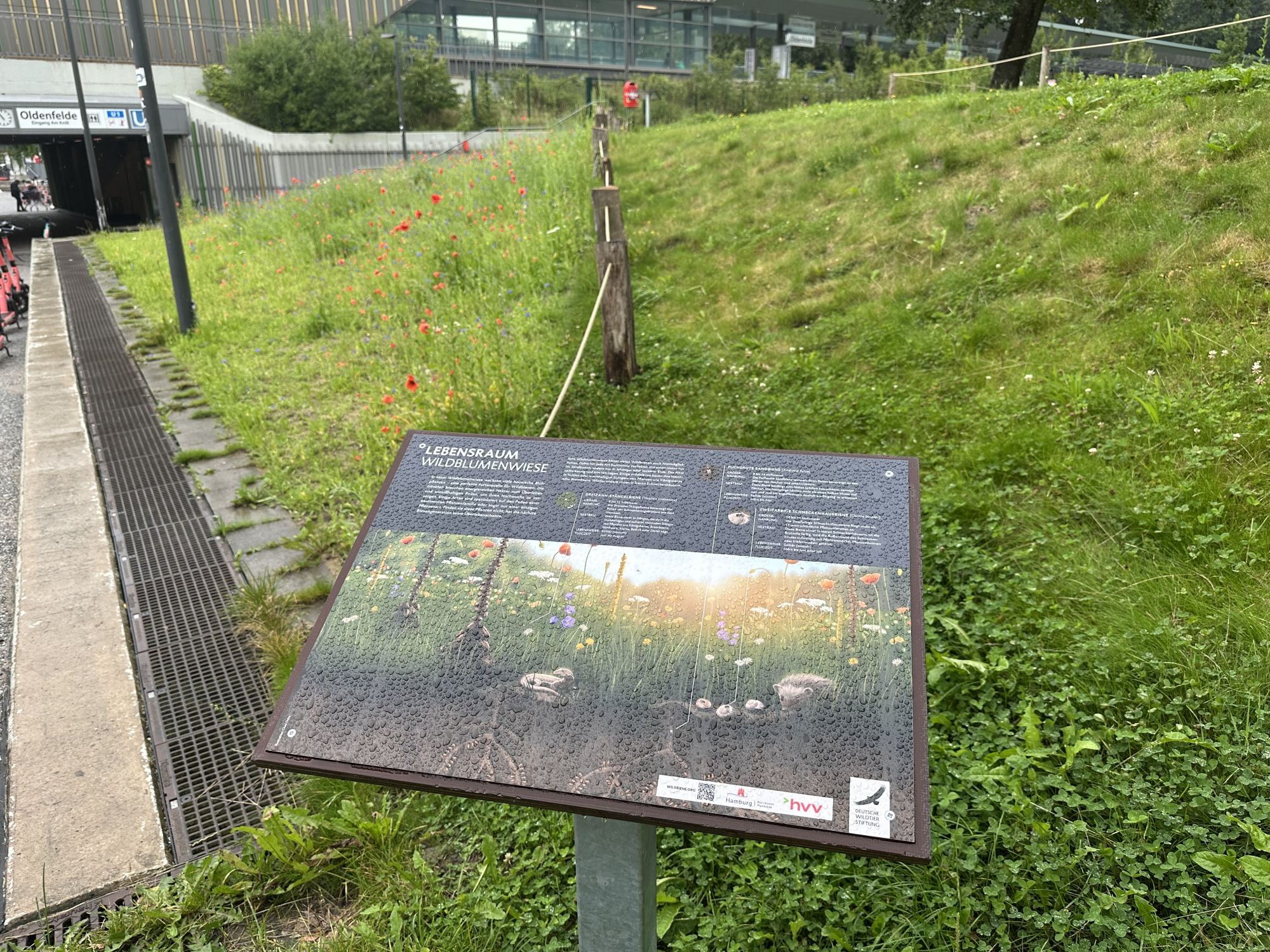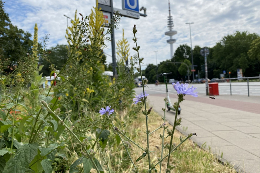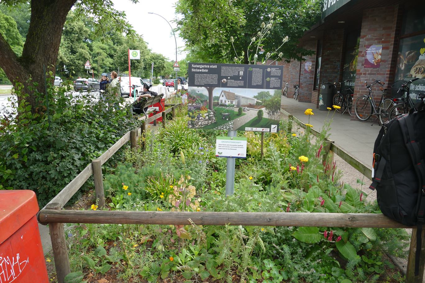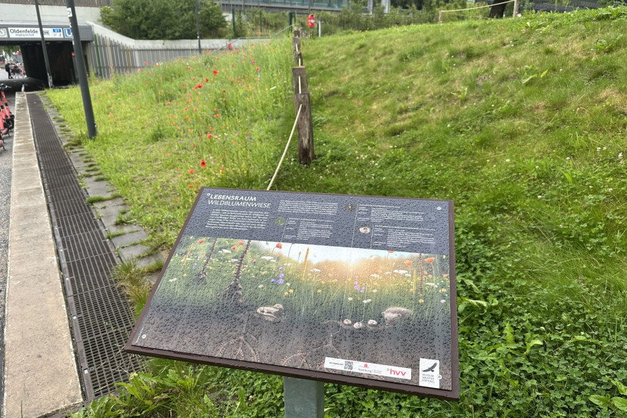 Eine Informationstafel am Gehweg informiert Passantinnen und Passanten über die Bedeutung der Fläche für Wildbienen und andere Insekten. Die Pflege erfolgt durch engagierte Ehrenamtliche des Netzwerks Buntes Band Eimsbüttel.