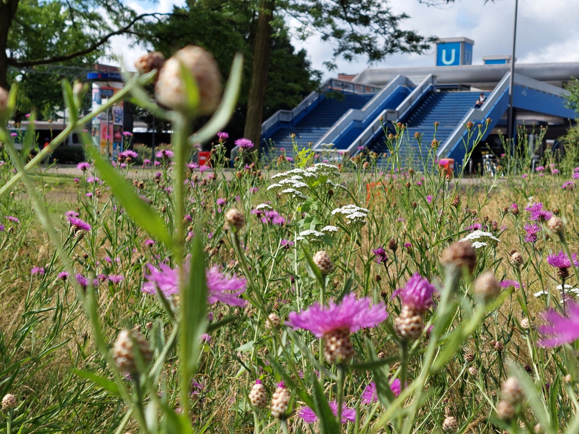 Flächengröße: ca. 600 m² (Teil einer rund 2.000 m² großen Grünfläche)Im Umfeld der Haltestelle Billstedt wurde 2021 ein Teil der bestehenden Grünfläche in eine artenreiche Blühfläche für Wildbienen und andere Insekten umgestaltet. Nach dem Umbruch der Grasnarbe wurde die Fläche mit regional zertifiziertem Wildblumensaatgut eingesät. Ergänzend wurden rund 450 heimische Stauden gepflanzt, darunter Margeriten, Lichtnelken und Seifenkraut, um bereits im ersten Jahr einen sichtbaren Blühaspekt zu erreichen.