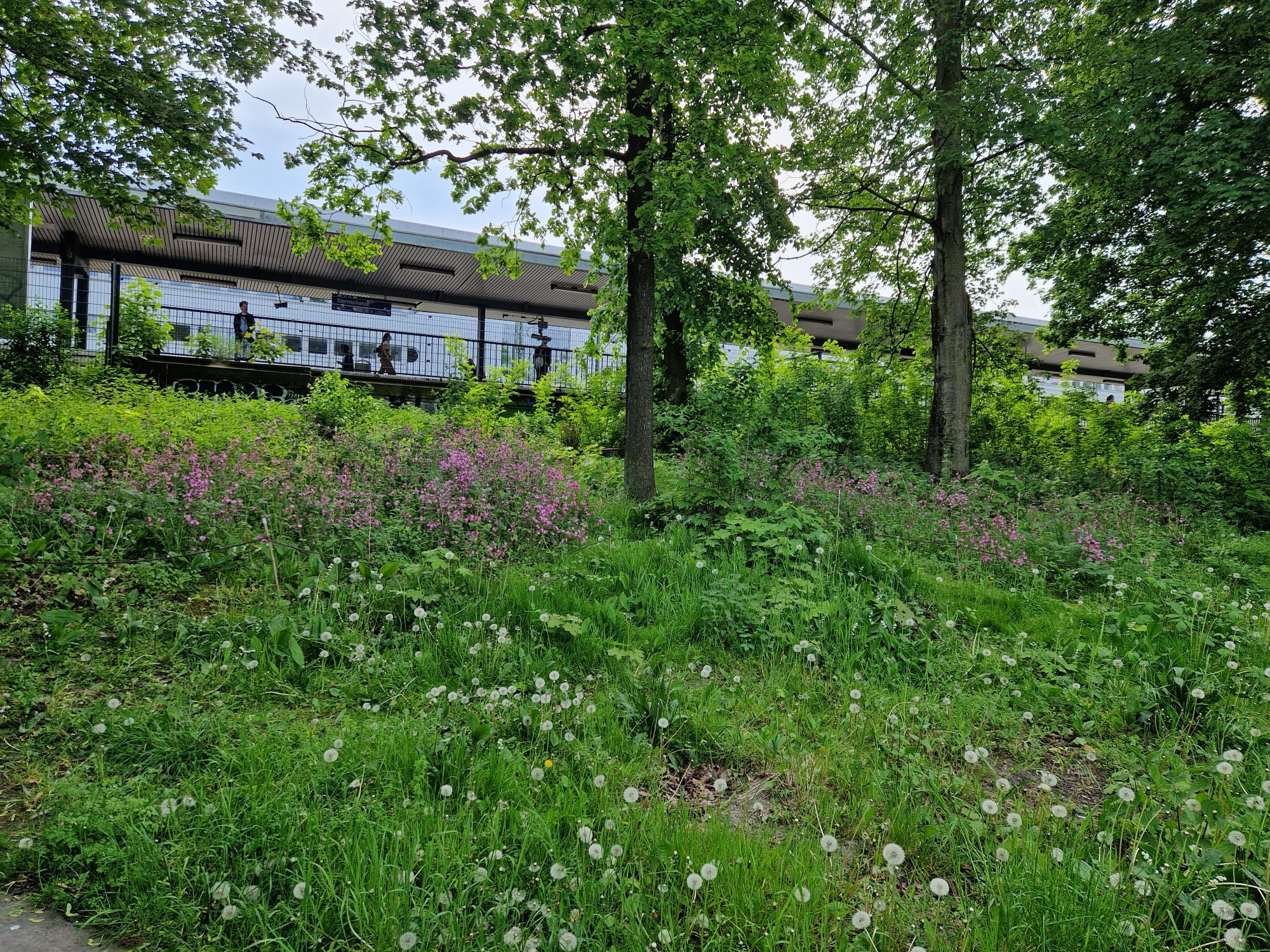 Anlage der Fläche: 2020Im Umfeld der Haltestelle Sternschanze wurden mehrere Flächen zwischen Gehweg und S-Bahn-Gelände zu Blühflächen für Wildbienen und andere Insekten umgestaltet. Nach der Entfernung der bestehenden Vegetation wurde der Boden vorbereitet und mit heimischen Wildstauden sowie regional zertifiziertem Wildblumensaatgut bepflanzt. Zusätzlich wurden im bewaldeten Bereich mehrere kleinere Wildstauden-Inseln angelegt. In den Jahren 2022 und 2023 wurden insgesamt rund 3.000 Frühblüher ergänzt.