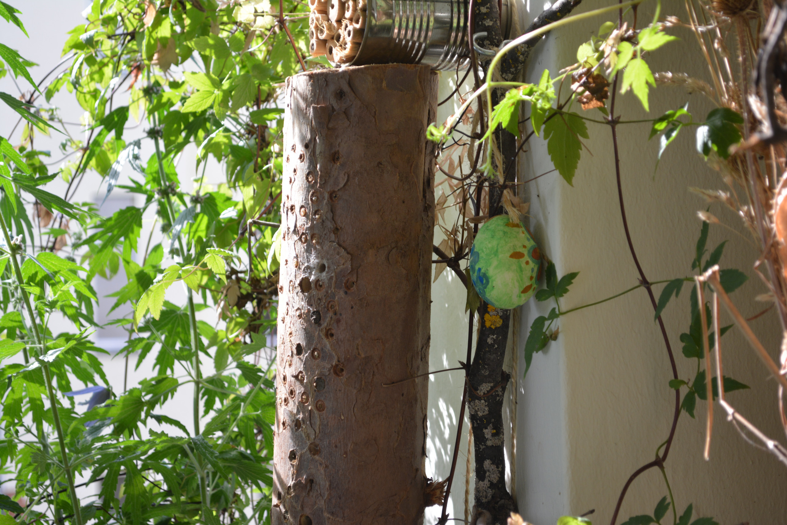Auf sonnigen Balkonen können Sie den Wildbienen verschiedene Nisthilfen anbieten – etwa ein Wildbienenhotel, das Sie an einen trockenen und windgeschützten Standort (am besten Richtung Süden) befestigen. Achtung: Beschattete oder frei hängende Nisthilfen werden nicht angenommen.