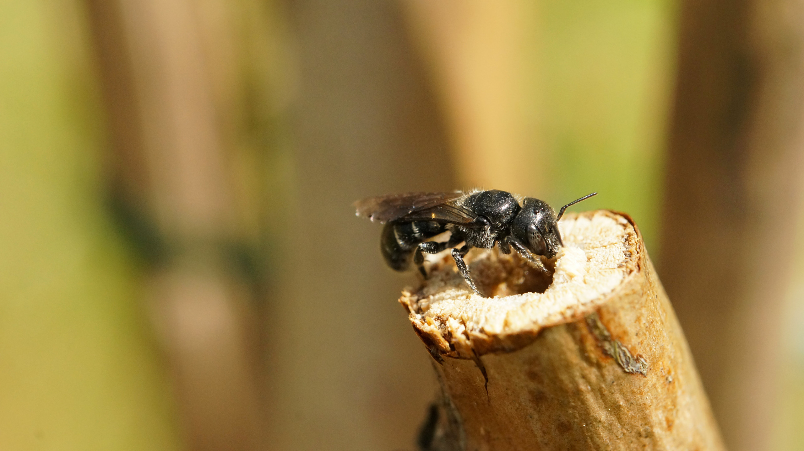 Abgestorbene Stängel von Disteln, Beifuß oder Königskerzen sowie Ranken von Brom- und Himbeeren dienen einigen Wildbienenarten als Nistplätze. Damit das Mark für die Wildbienen zugänglich ist, sollten Sie die Stängel anschneiden und möglichst einzeln senkrecht bzw. leicht schräg an sonnigen Stellen fixieren. Disteln und Beifuß – ebenfalls attraktiv für Stängelnister – können Sie im Kübel anpflanzen.
