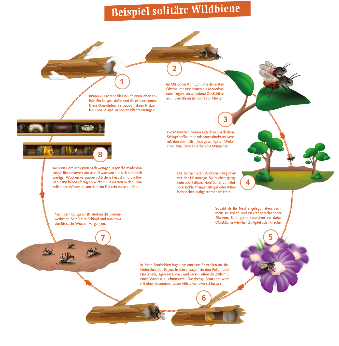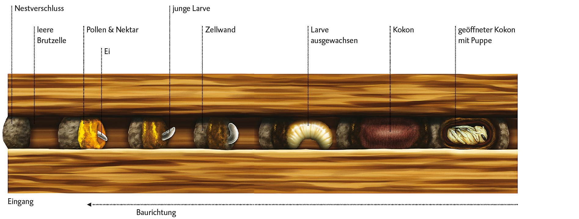 Bienen können wählen, ob sie befruchtete oder unbefruchtete Eier legen und so über das Geschlecht der Nachkommen entscheiden. Wenn sie das Nest bauen, legen sie befruchtete weibliche Eier in die ersten Kammern, danach männliche. Entsprechend schlüpfen im Frühjahr die Männchen zuerst und warten direkt am Nest auf die Weibchen. Kurz nach der Paarung sterben die Männchen, die Weibchen beginnen sofort mit dem Nestbau. Nach nur wenigen Wochen ist dann auch ihr Wildbienenleben zu Ende. Die Eier entwickeln sich im Nest zu Larven, dann zu Puppen mit Kokon, um als fertige Bienen bis zum nächsten Frühjahr zu überwintern. Dann fliegen sie aus – und der Kreislauf beginnt von vorn.