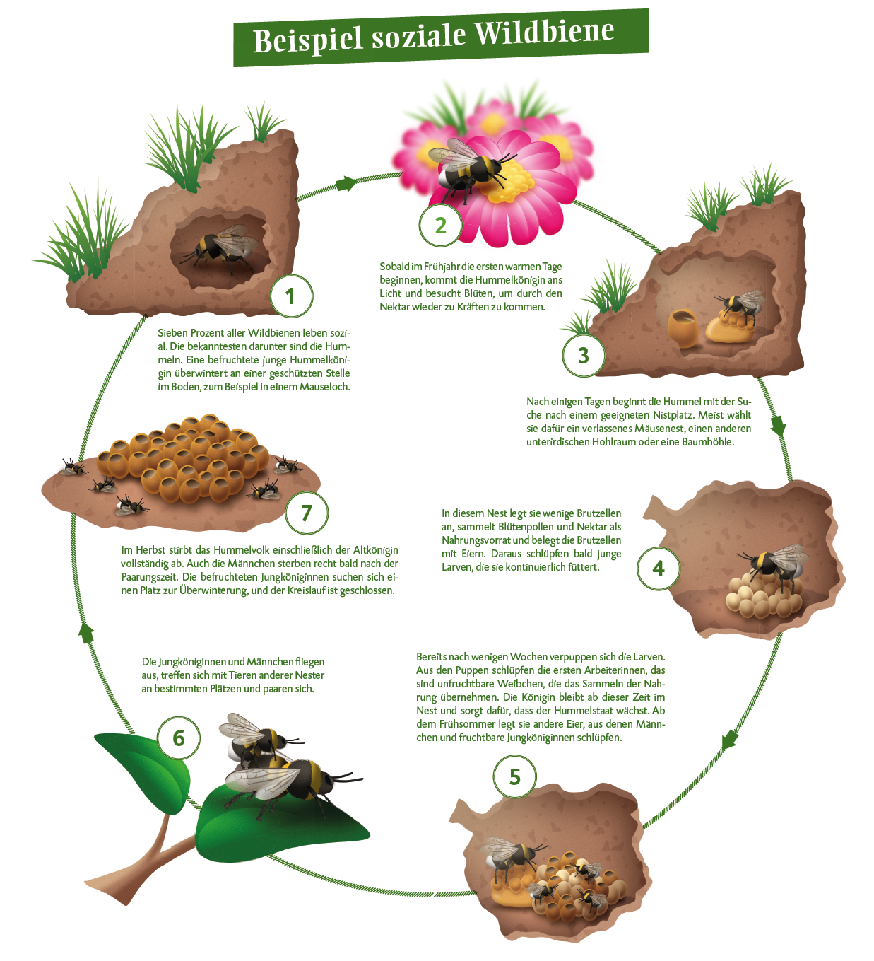 Anders als die solitär lebenden Wildbienenweibchen, die pro Saison durchschnittlich drei bis sechs Wochen aktiv sind, brauchen die sozialen Arten die gesamte Vegetationsperiode, um Nachkommen zu erzeugen.
