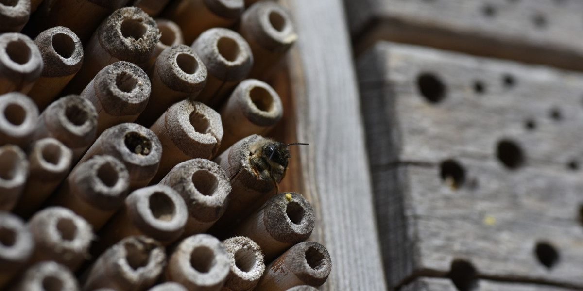 In den Nisthilfen des Lehrpfads am Spreebogenpark lassen sich gut Rote Mauerbienen (Osmia bicornis) beobachten. Diese Wildbienenart wurde auch schon auf anderen Blühflächen hochgeladen. Foto: S. Lokatis