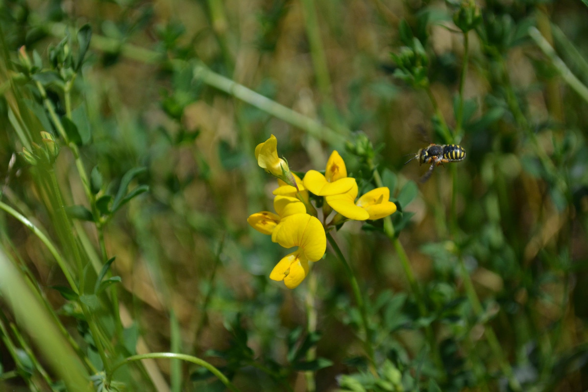 Wollbiene im Anflug! Hornklee (Lotus corniculatus) ist für viele Wildbienenarten eine wertvolle Pollenquelle.