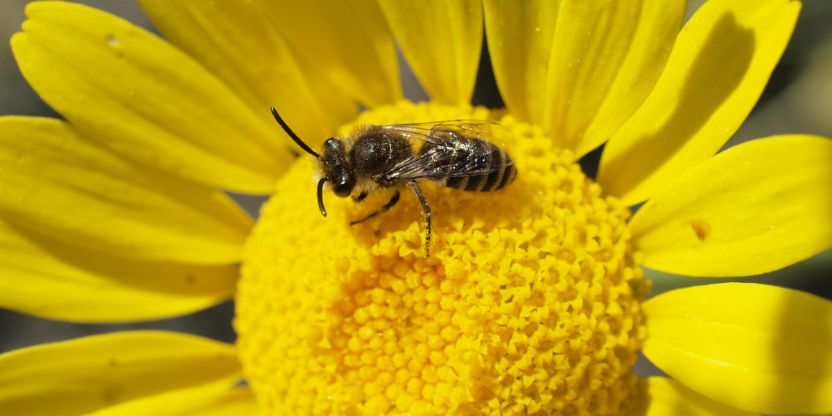 • Wildbienen wie dieses Seidenbienen-Weibchen sammeln Pollen und Nektar an den offenen Blütenkörben. Foto: Line Sabroe / Flickr / CC BY 2.0