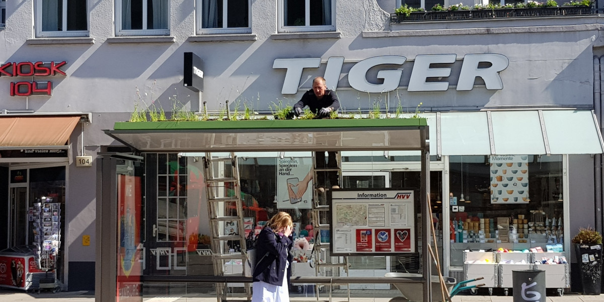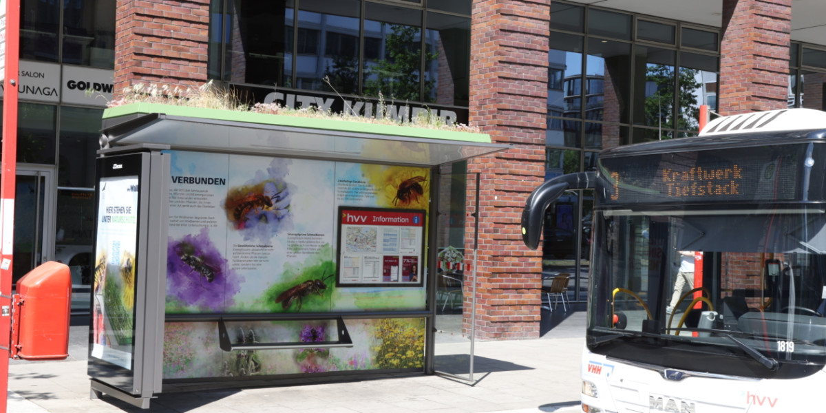 Im Rahmen eines Pilotprojektes des Hamburger Senats und der Wall GmbH hat die Wall GmbH in Zusammenarbeit mit der Deutschen Wildtier Stiftung auf zwei ausgewählten Buswartehäuschen des Stadtgebiets (Stadthausbrücke & Osterstraße) blütenreiche Gründächer zur Förderung der Wildbienen- und Insektenfauna in der Stadt angelegt. Im Jahr 2022 wurde ein Monitoring der auf den Gründächern auftretenden Wildbienen- und Wespenarten durchgeführt, um erste Ergebnisse zur Bedeutung dieser kleinflächigen Habitatinseln für blütenbesuchende Insekten im Lebensraum Stadt zu erhalten. Seit kurzem stehen uns die Ergebnisse des Monitorings zur Verfügung: Es konnten insgesamt 49 verschiedene Bienen- und Wespenarten nachgewiesen werden, darunter auch ein Neunachweis für die Stadt Hamburg. Seit 2024 wird das Projekt auf fünf weitere Standorte ausgeweitet. Wir freuen uns sehr über diesen Erfolg!