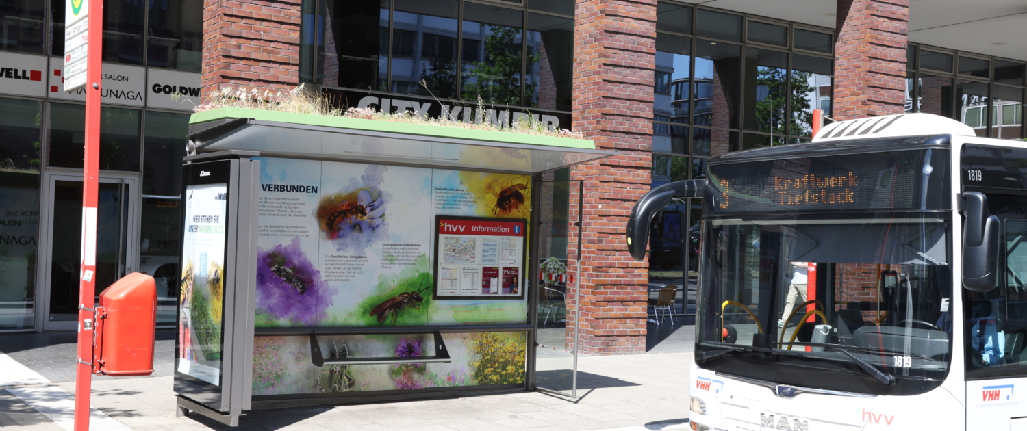 Haltestellen sind mehr als Verkehrsknotenpunkte – sie sind Orte der Begegnung und prägen das Stadtbild. Durch die gezielte Gestaltung von Grünflächen entstehen hier neue Lebensräume für Wildbienen und andere Insekten.