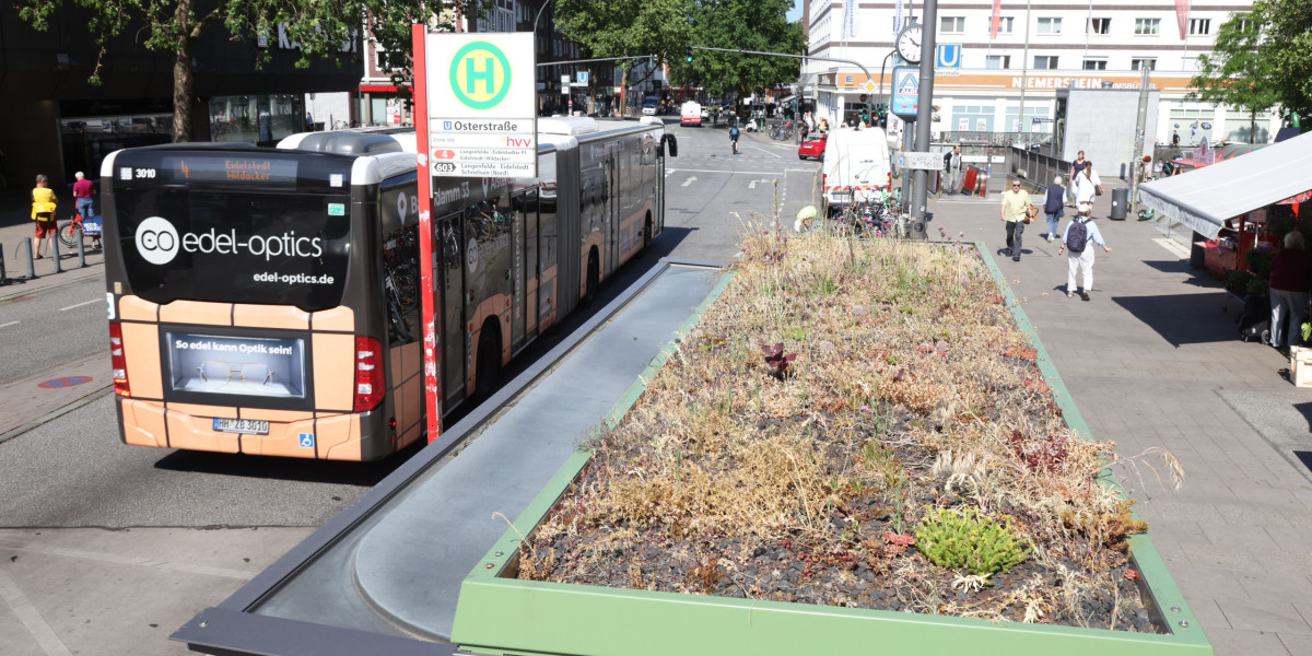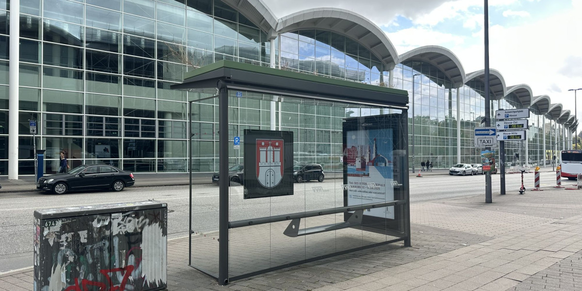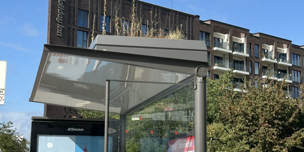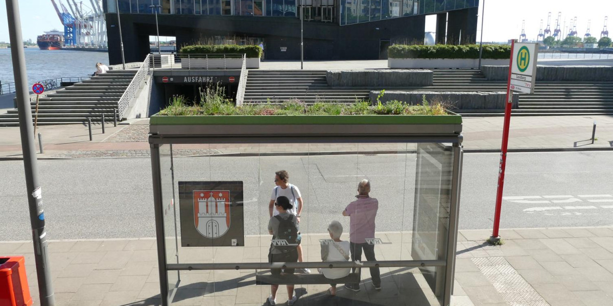Begrünter Fahrgastunterstand an der Stadthausbrücke.