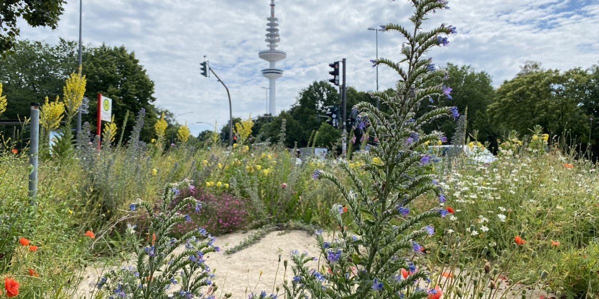 Ein langgestreckter Grünstreifen im Nordosten Hamburgs bietet ideale Voraussetzungen für artenreiche Blühflächen. Sonnige, nährstoffarme und teils sandige Bereiche schaffen gute Bedingungen für Wildbienen und Tagfalter.
