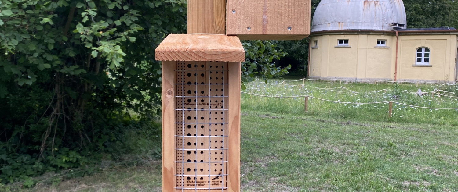 Im Astronomiepark der Sternwarte Bergedorf wurden im Jahr 2023 verschiedene Maßnahmen zur Förderung heimischer Wildbienen umgesetzt. Dabei entstanden Blühwiesen, Beete mit heimischen Wildsträuchern und -stauden sowie Nistmöglichkeiten. Wir freuen uns über das entstehende Wildbienenparadies in Hamburg.