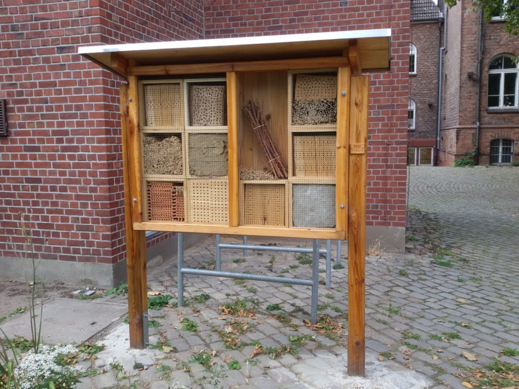 Ergänzt wird die Fläche durch eine große Nisthilfe, die Wildbienen geeignete Brutplätze bietet und gleichzeitig über das Projekt informiert.