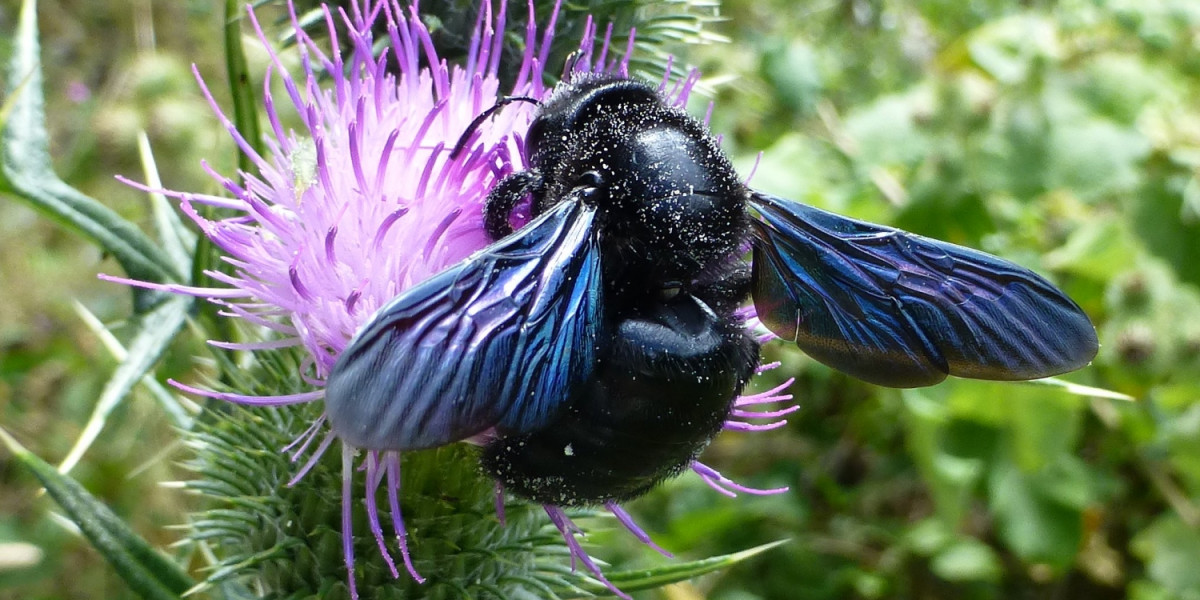 Vom Aussehen her fällt diese Wildbiene sofort ins Auge und ist mit keiner anderen Art in Deutschland zu verwechseln. Xylocopa violacea gehört zu den größten heimischen Wildbienen und beeindruckt mit einem komplett tiefschwarzen, kräftigen Körper. Auch die Behaarung ist schwarz, während die Flügel in einem metallisch blau-schwarzen Ton schimmern. Weibchen erkennt man an den teilweise gelben Fühlerunterseiten, Männchen dagegen an ihren gebogenen Fühlerenden und zwei gelben Fühlergliedern direkt dahinter.