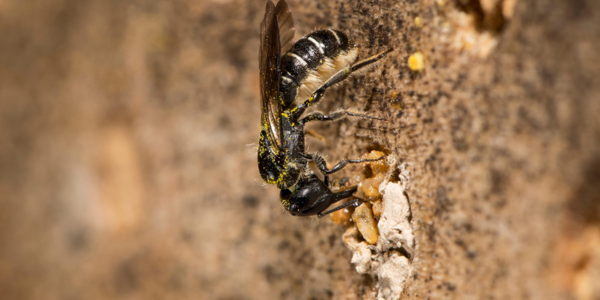 • Ein Weibchen der Hahnenfuß-Scherenbiene verschließt ihr Nest und arbeitet kleine Steinchen ein, die den Verschluss besonders fest machen.
