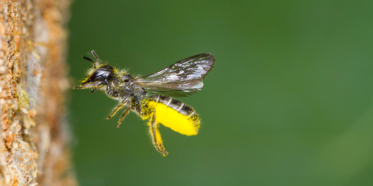 • Ein Weibchen der Hahnenfuß-Scherenbiene im Anflug auf das Nest, die Bauchbürste gefüllt mit Pollen der Futterpflanze Hahnenfuß.