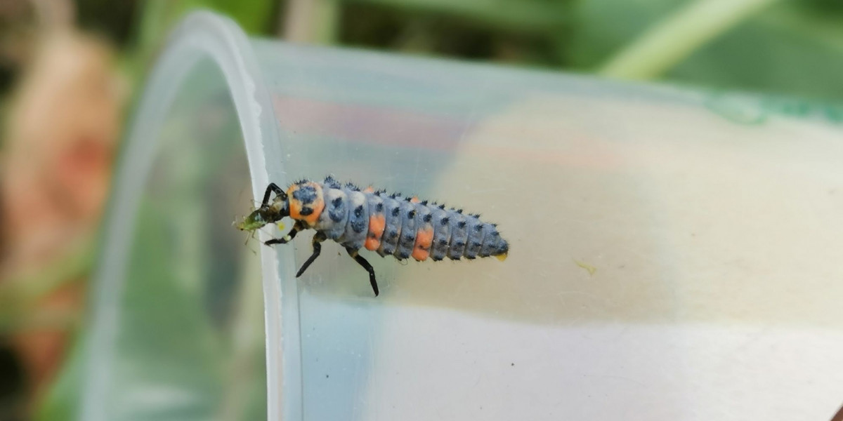 Larve des Siebenpunkt-Marienkäfers, beobachtet auf der Blühfläche der Freien Universität Berlin. Die Insekten können in verschiedenen Entwicklungstufen (Adult, Ei, Larve oder Puppe) erfasst und hochgeladen werden. Foto: S. Lokatis
