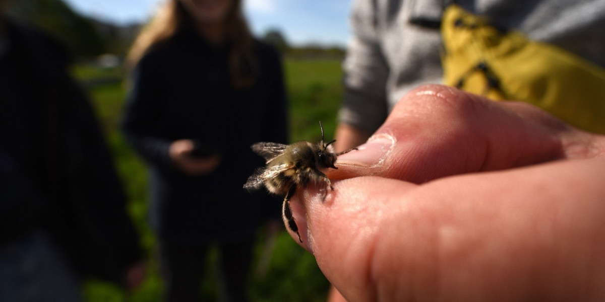 Wildbienenexperte Frederik Rothe zeigte ein Männchen der Frühlings-Pelzbiene Anthophora plumipes bei der City Nature Challenge im April 2024. Foto: S. Lokatis