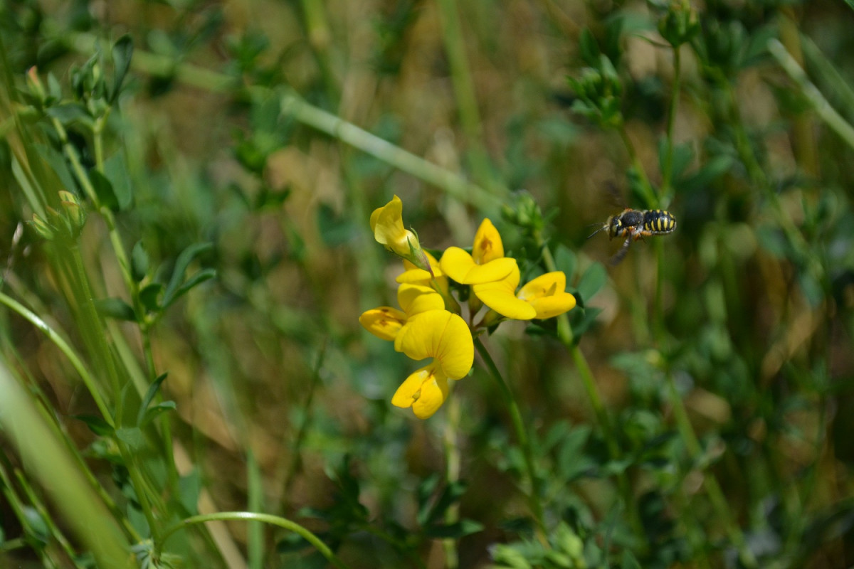 Wollbiene im Anflug! Hornklee (Lotus corniculatus) ist für viele Wildbienenarten eine wertvolle Pollenquelle.