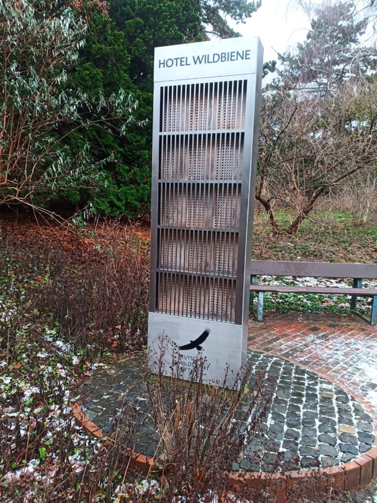 Eigentlich ein idealer Ort für die große Nisthilfe aus Edelstahl. In der Vergangenheit wurde sie nur von wenigen Wildbienen genutzt. Unsere Vermutung: die Wildbienen erkennen die Niststrukturen aufgrund der Edelstahlverblendung nicht. Die Verblendung ist aber notwendig, damit Vögel die Wildbienennisthilfe nicht als Buffet nutzen können. Über zwei Jahre lang haben wir alternative Edelstahlfronten getestet. Seit dem 15.01.2024 besitzt die große Nisthilfe nun eine neue Verblendung, die es den Wildbienen ermöglicht, die dahinterliegenden Niststrukturen besser zu erkennen. Wir sind gespannt, ob es im Sommer 2024 in Planten un Blomen summt und brummt.