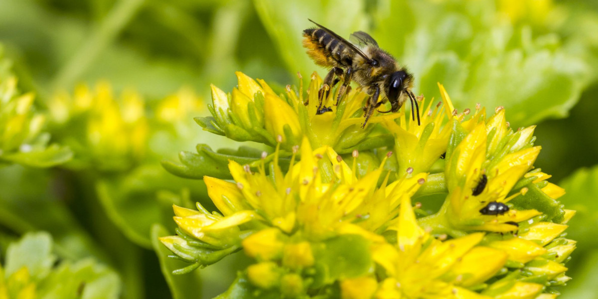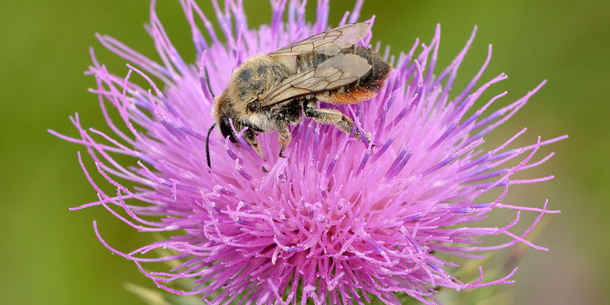 Die Bunte Blattschneiderbiene gilt aktuell als ungefährdet in Deutschland. Dennoch hat sie, wie alle Wildbienenarten, mit dem Verlust von Lebensräumen und einem geringen Nahrungsangebot zu kämpfen.