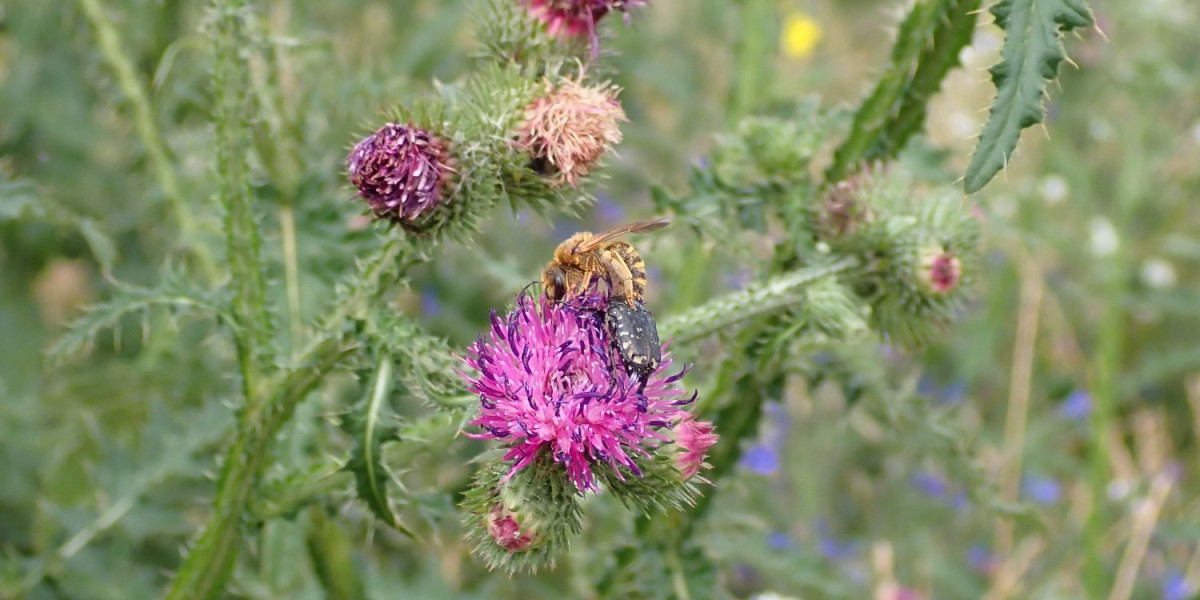 Im Hochsommer nimmt die Vielzahl an verfügbaren Blüten im Vergleich zum Frühjahr und Frühsommer wieder ab. Besonders die Hitze und Trockenheit der letzten Jahre wirken sich negativ auf die ohnehin schon zu geringe Blütenvielfalt aus. Für die Gelbbindige Furchenbiene, ist eine hohe Vielfalt an Blüten aber unabdingbar, um zu überleben.